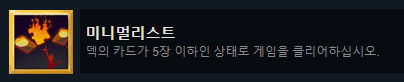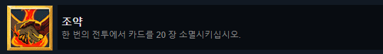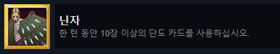 이 두 개 역시 플레이 하다보면 자연스레 달성되지만, 그냥 극한압축 + 추월 + 마음의 요새, 1코 진노+1코 명상 덱이면 사이클이 무한으로 돌아가기 때문에 쉽게 달성할 수 있다.