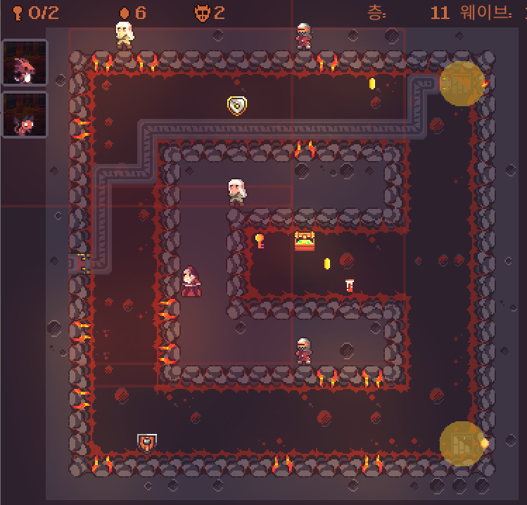 스크린샷처럼, 원하는 탈출구를 향하되, 골드나 방패, 물약, 열쇠 등을 집어서 탈출할 수 있도록 탈출루트를 설정, 배치해 플레이 하는 게임이다.